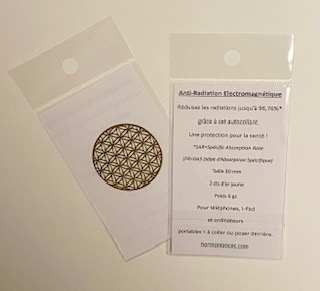 Autocollant Anti-Radiation Electromagnétique pour le smartphone, tablette, ordinateur, wifi, micro-ondes,… en forme de Fleur de Vie (géométrie sacrée) et en or jaune.