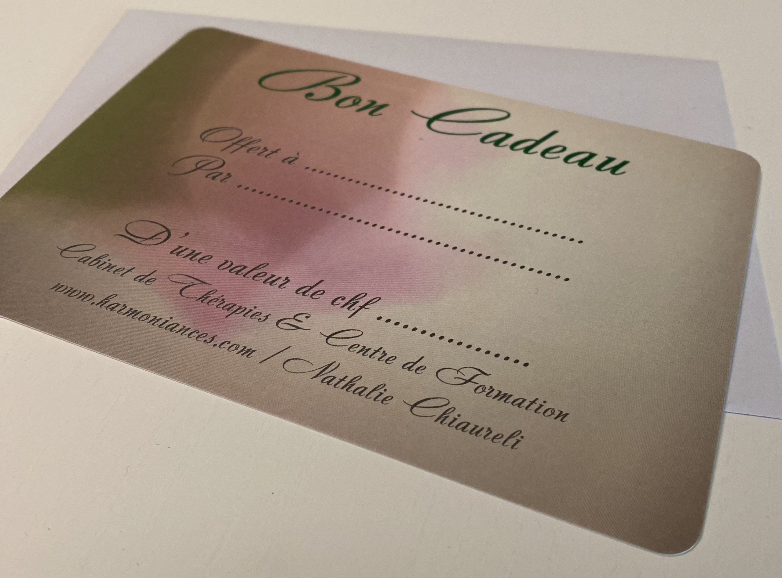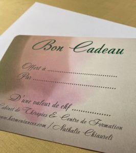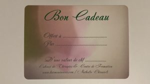 Offrez un bon (envoi postal ou e-mail) pour un soin au cabinet/à distance ou participer à une formation en présentiel/à distance.